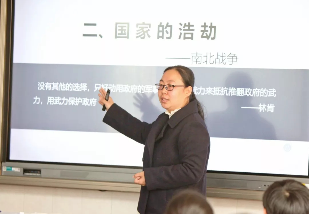历史老师刘筠执教《美国内战》,以美国黑人的现状、美国第一位黑人总统奥巴马导入新课,从当年美国黑人奴隶的悲惨遭遇,展现并剖析美国内战的历史背景、战争的进程及结果、影响。这堂课设问精妙,环环相扣;材料精选,论从史出;组织精心,破旧立新;榜样精神,引领人生。这堂课,赢得了听课老师的普遍称赞,专家点评:内容丰富,生动有趣,语言精炼,设问精妙,符合学生的认知能力,有利于提升学生史学素养。其亮点是突出并强调了“国家统一”的观点,具有现实意义。